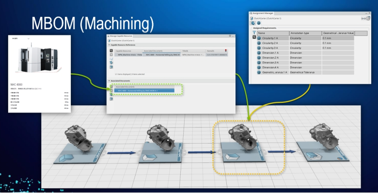如下图所示,在工艺路线定义的时候,我们可以看到每个工序对应的物料、分配的制造需求以及需要的设备和刀具等。可以看到,中间的制造需求页面那里,分配的四条需求都有橙色的外框。这个橙色,代表在后续的CAM编程的时候,CAM人员已经确认过这条需求,确认过的需求会自动的变成橙色。这样的方式,就保证了大家所加工的零件,都是面向设计的要求的,并实现了零件上的PMI信息,在设计阶段、工艺规划阶段以及CAM阶段的重用。